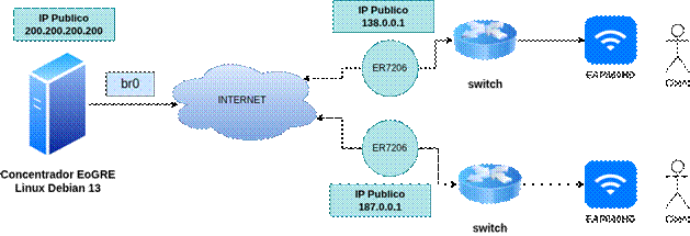 Este artigo descreve a implementação de um servidor concentrador EoGRE (Ethernet over GRE – protocolo IP 47) em Debian 13 com IP público próprio, permitindo integrar múltiplos EAPs Omada remotos.