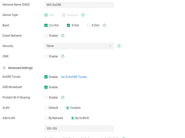 Inicialmente, deve-se configurar na controladora Omada o IP do túnel EoGRE e definir a MTU em 1468. Em seguida, é necessário configurar o SSID, indicando que o tráfego utilizará o túnel previamente criado. Adicionalmente, neste cenário será utilizada VLAN dinâmica no SSID, conforme apresentado na configuração a seguir.