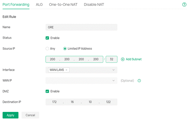 Neste cenário, foi utilizado um roteador ER com IP público na rede onde o EAP está conectado. Para que o tráfego possa transitar entre o EAP e o concentrador EoGRE, é necessário configurar um redirecionamento adequado. Como se trata de tráfego EoGRE (GRE – IP 47), deve-se criar uma regra para que, quando a origem for o IP público do concentrador EoGRE, o gateway realize uma DMZ para o IP privado do EAP. Siga o passo a passo descrito a seguir.