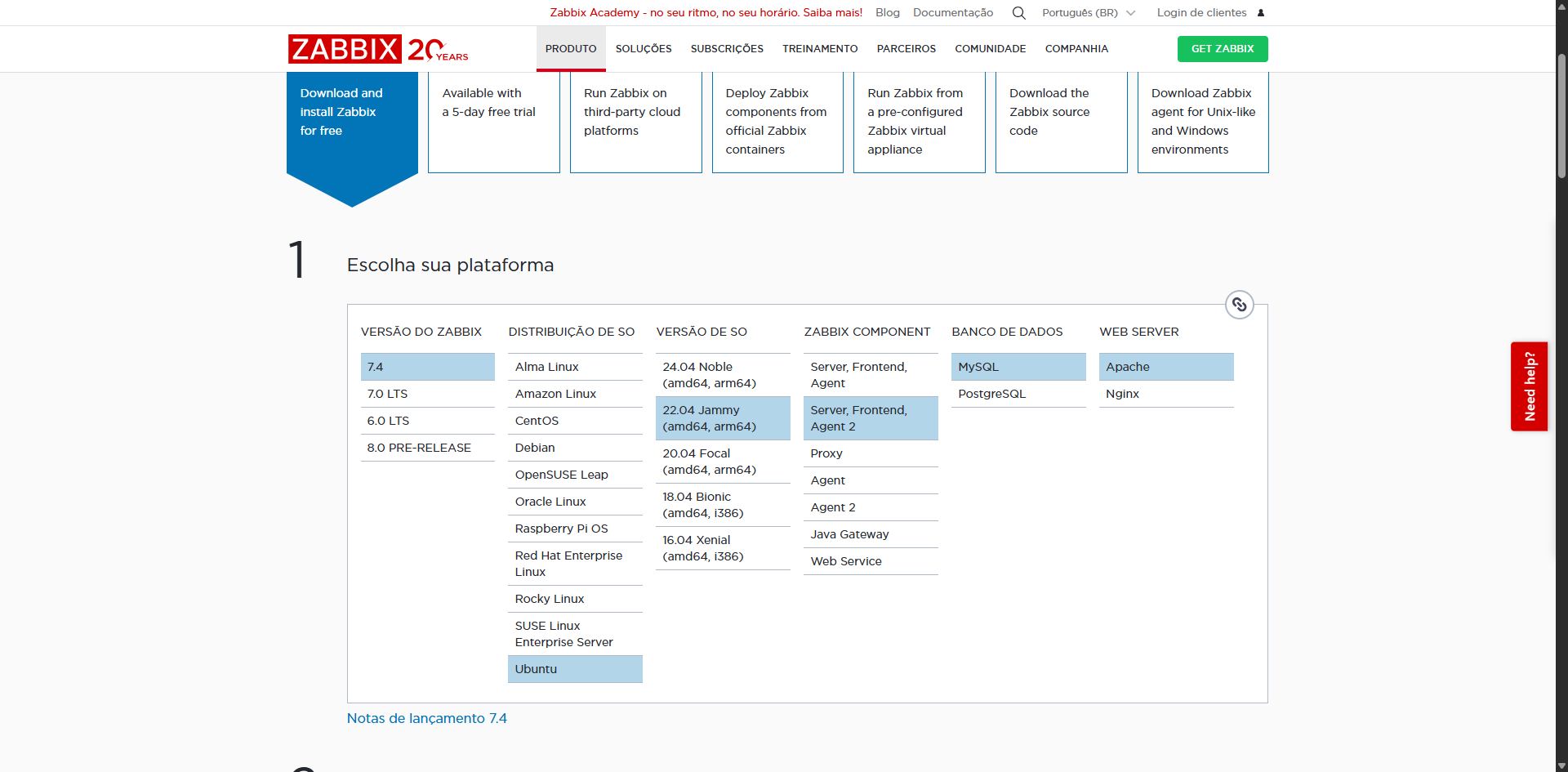 Acesse o link Download Zabbix para baixar e instalar o Zabbix 7.4 de acordo com as instruções de instalação do site oficial. Aqui usaremos a distribuição Ubuntu 22.04 como exemplo.