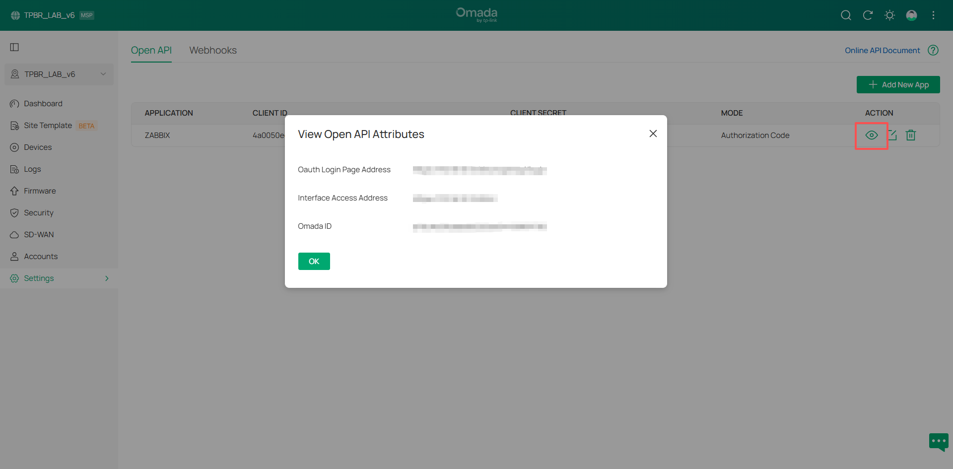 Clique no ícone de visualização à direita e salve as informações de "Interface Access Address" e "Omada ID"