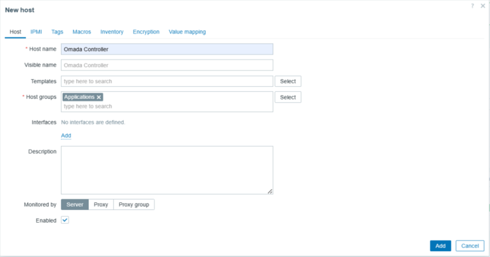 Na sua barra lateral, vá em “Data Collection” e em Hosts. Clique para criar um novo host e preencha o nome, "Omada Controller"