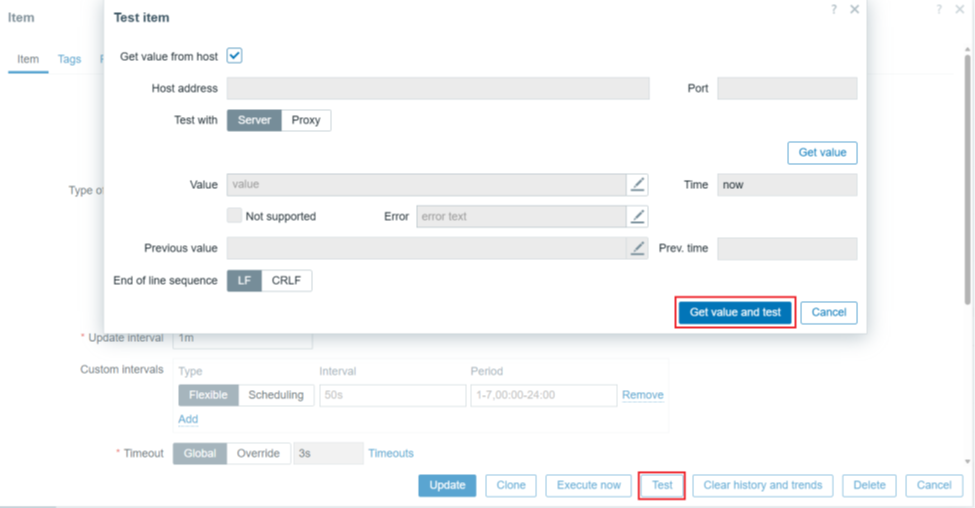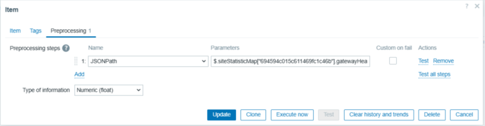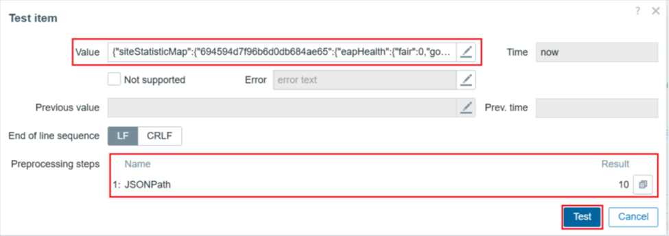 Clique no botão “Test” à direita para verificar a configuração. Use os dados mais recentes do item de script criado anteriormente (encontrado na seção “Monitoramento”) como valor de entrada para este teste.