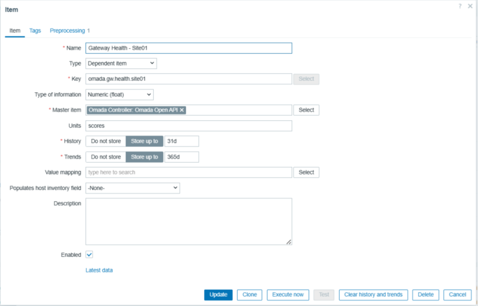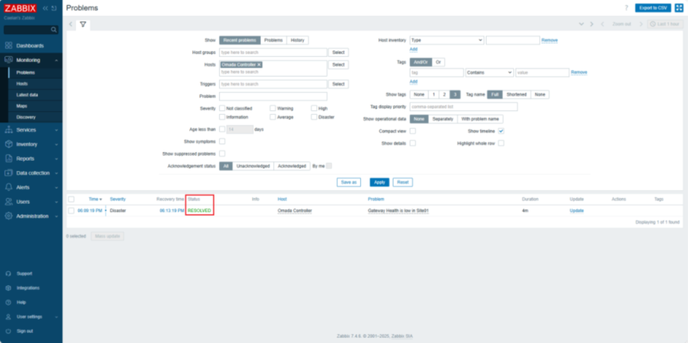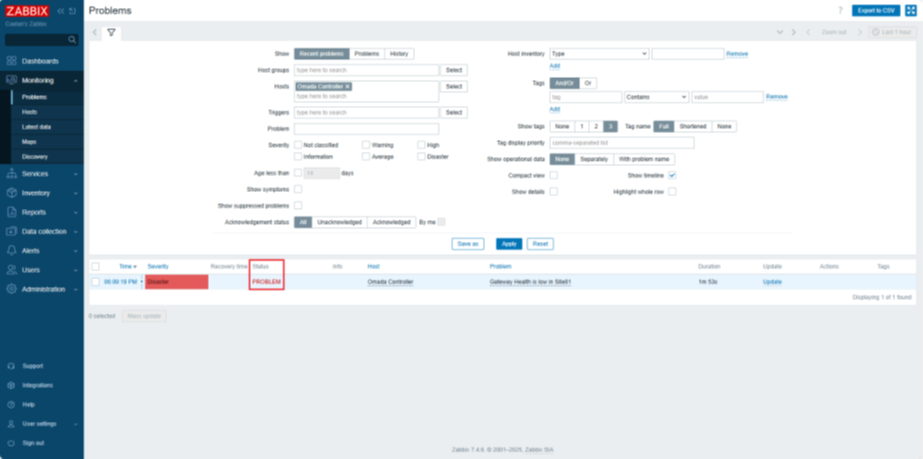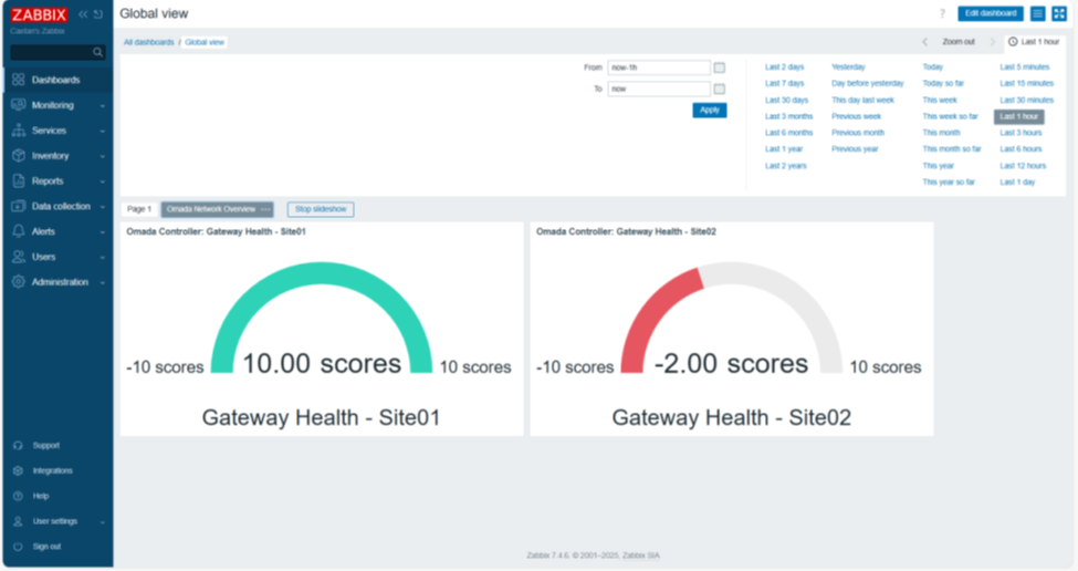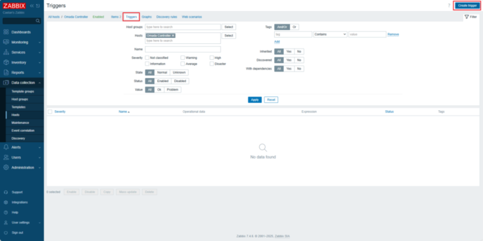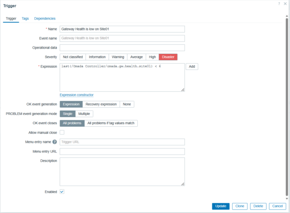 - Expression: Expression: last(/HostName/omada.gw.health.site01) < 6