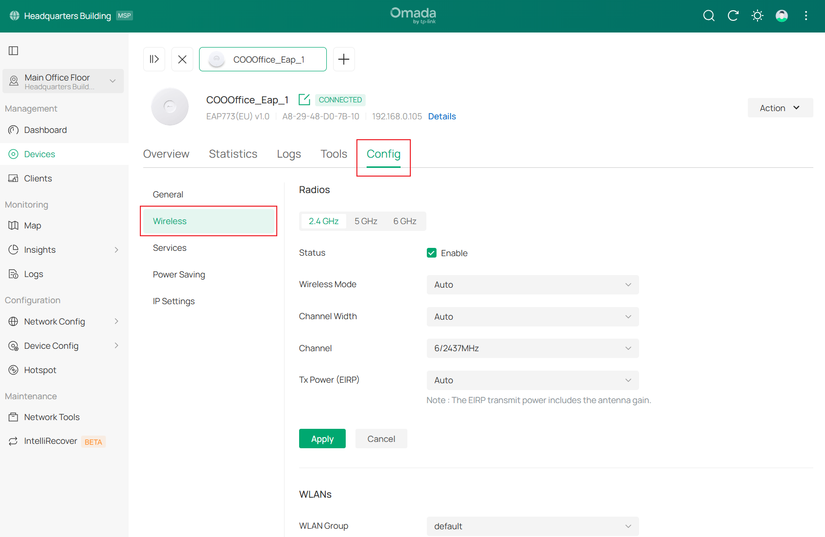 Step 1. Open Omada Controller. Go to Site > Devices > Device List and click the AP that you would like to configure. Then you will see the “Manage Device” button on the right side.