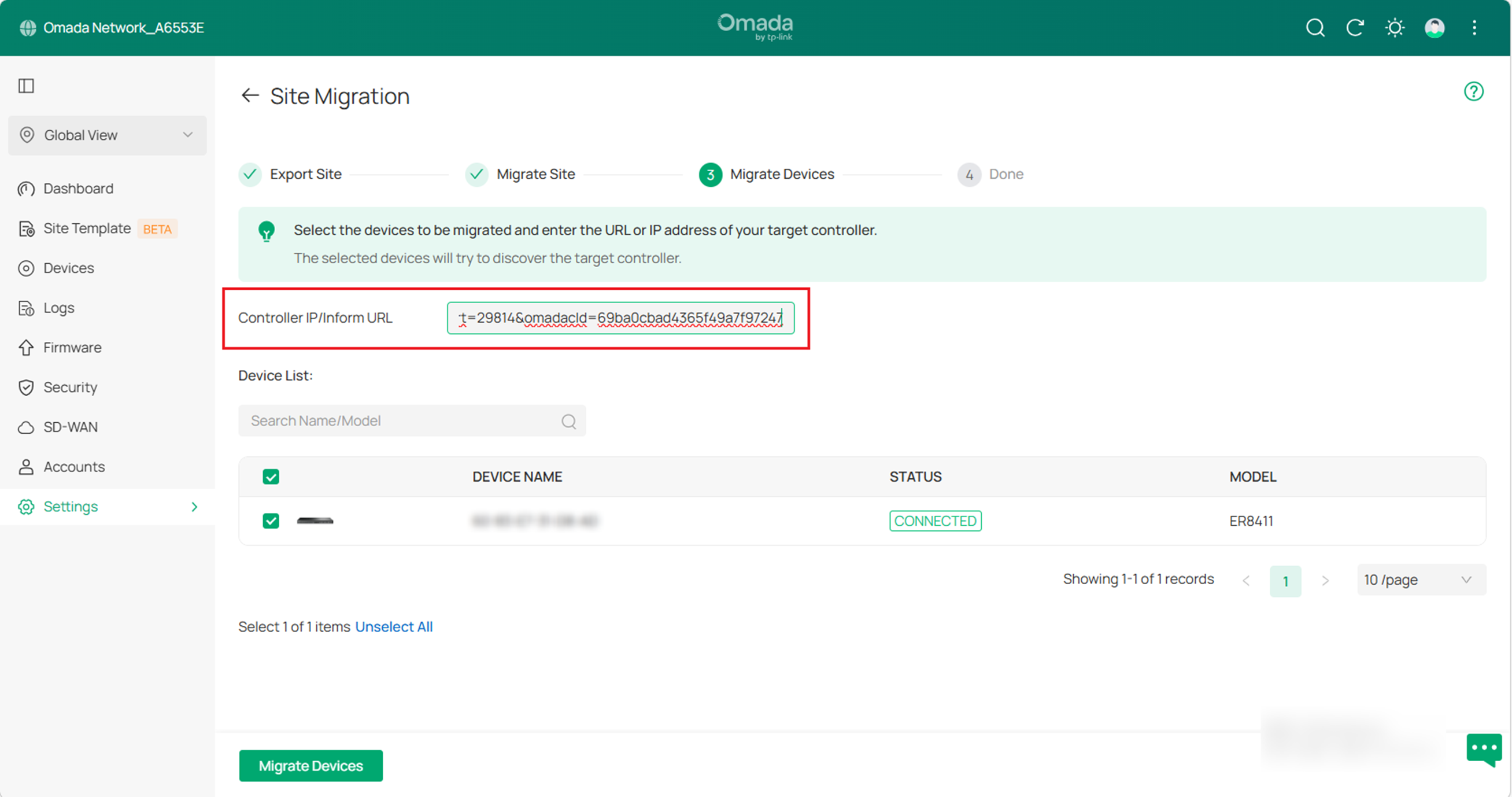 C. Verify that all the migrated devices are visible and connected to the target controller. When all the migrated devices are in Connected status on the Device page on the target controller, click Forget Devices on the previous site to finish the migration process.
