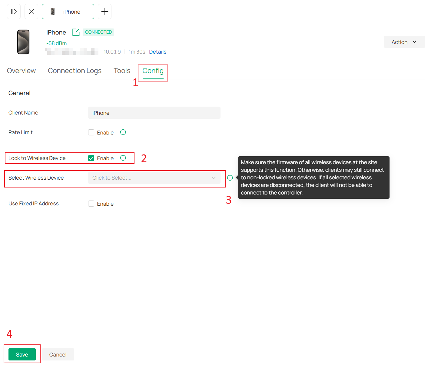 Step 3. Go to Config page. Enable Lock to Wireless Device option and select the target wireless device. Then Save the settings.
