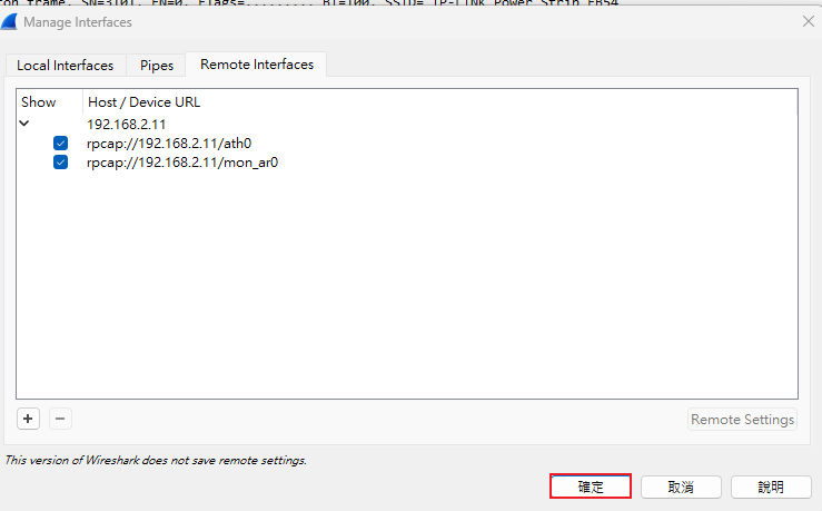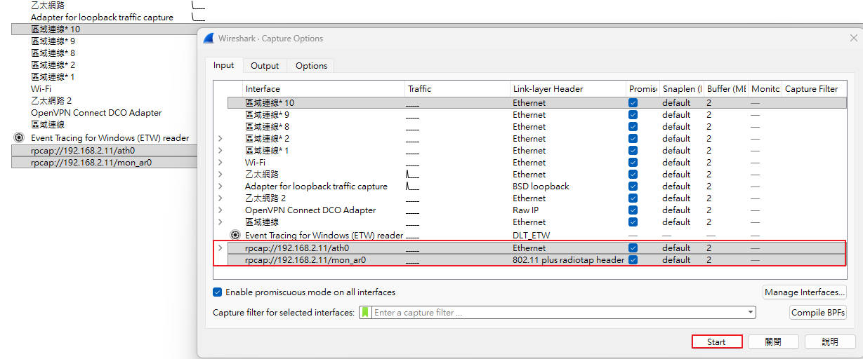 步驟 10. 當看到 rpcap://IP address/mon x 和 rpcap://IP address/ath x, 代表遠端封包擷取介面已成功新增,點擊 ‘Start’ 就能擷取封包。