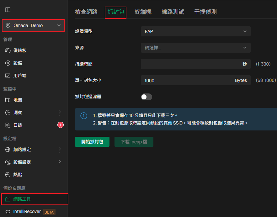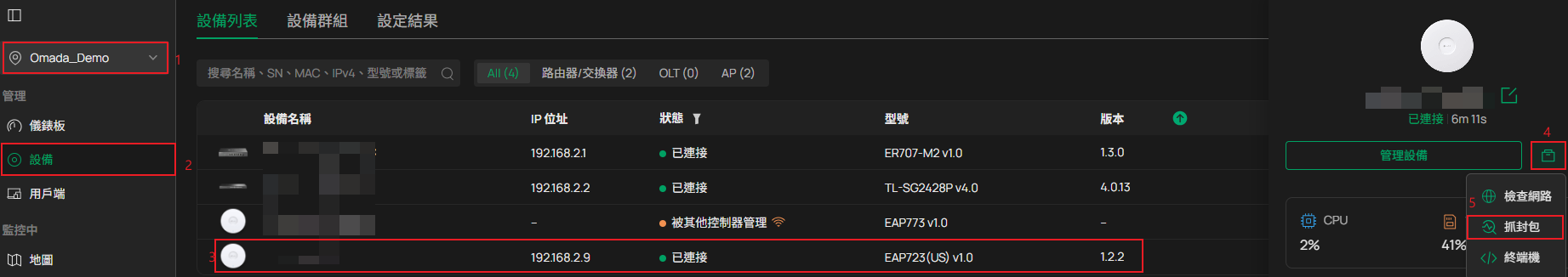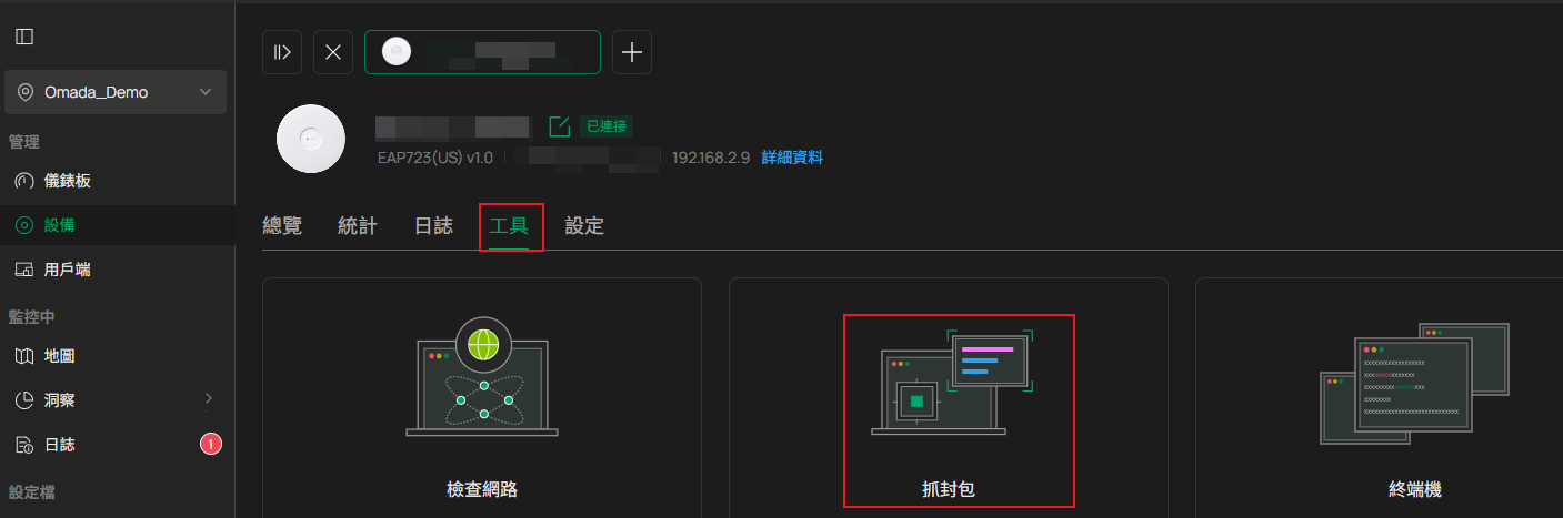 - 路徑: 站點 > 設備 > 管理設備 > 工具 > 抓封包