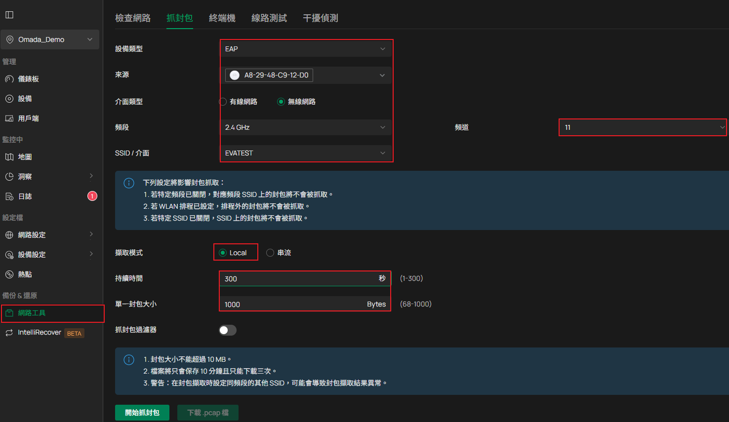 - Local 模式: 當 Omada 控制器端接收到無線封包擷取指令後,EAP 便會執行無線封包擷取流程。擷取到的封包會被封裝成 .pcap 檔案並存於EAP內部,此模式允許使用者從控制器的網頁介面下載該檔案。