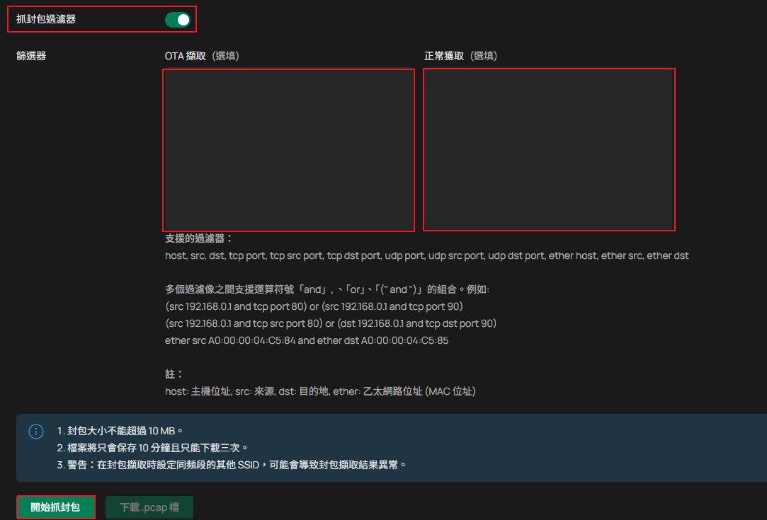 - 一般型號的無線介面若被設為監聽模式以進行封包擷取,會導致連接到該封包擷取 EAP 設備(僅限 MTK 晶片型號,如 EAP615-Wall v1、EAP613v1、EAP610v3、EAP650-Wall v2 等)的無線用戶端斷線,但不會影響非封包擷取設備以及連接到非封包擷取 SSID 的用戶端。