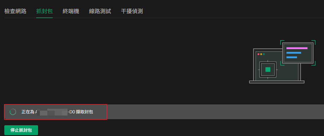步驟4. 點擊上圖的開始抓封包便能看到設備正在進行封包擷取
