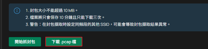 步驟5. 完成封包擷取後,點擊下載.pcap 檔,擷取的封包便能存於內部資料夾。
