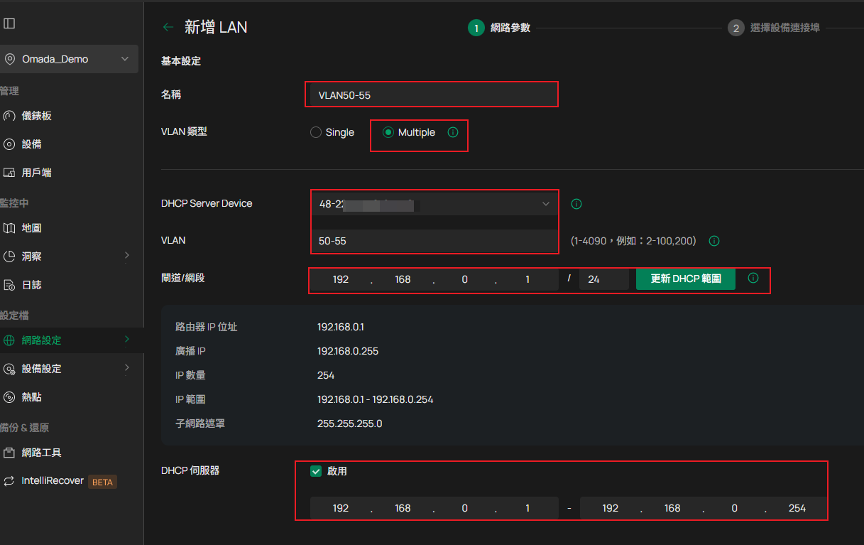 步驟 2. 勾選 VLAN 類型為 Multiple, DHCP Server Device設為路由器,並指定 VLAN ID 範圍;閘道/網段、DHCP範圍、DHCP伺服器依實際需求設定後,點擊下一步並套用。