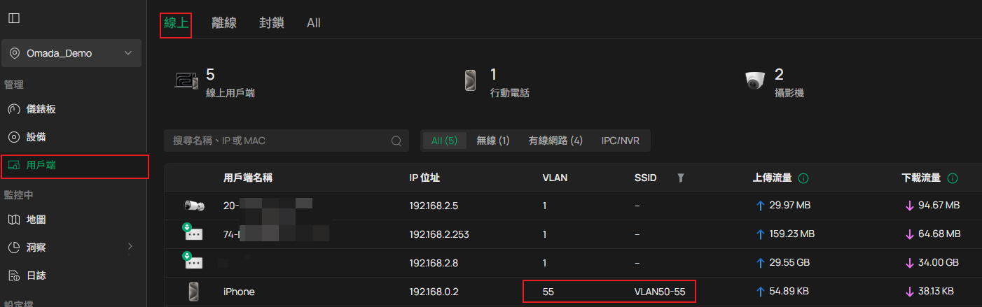 前往用戶端確認連線裝置是否正確取得VLAN ID,連線的裝置會被分配到 VLAN ID 範圍為 50 至 55 的 VLAN,且僅使用一個 Layer 3 介面。