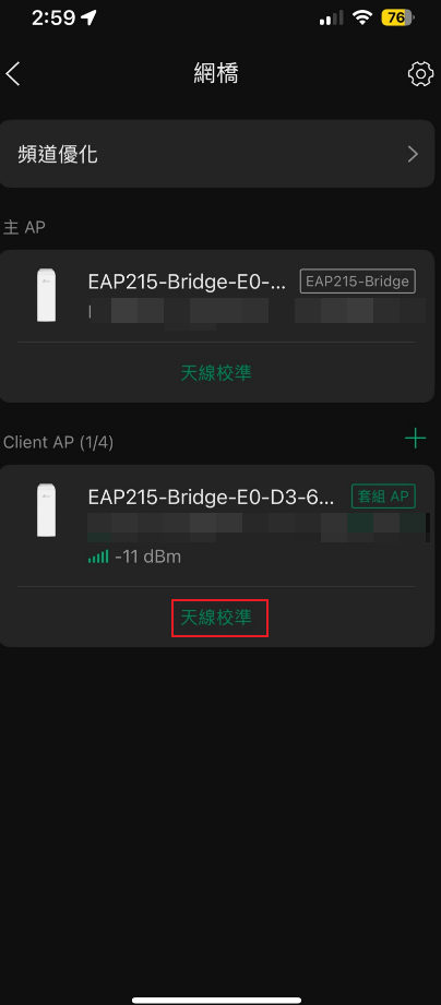 步驟 1. 依據如何設定點對點網橋連線中的說明,配對網橋套件,透過Omada APP 進到網橋的管理介面,在主網橋/子網橋上點擊 天線校準 。