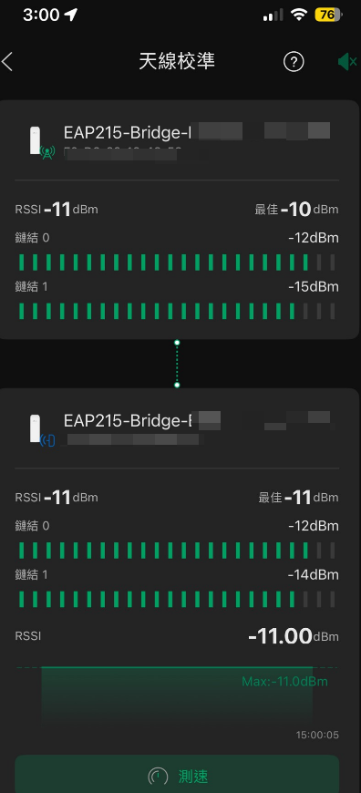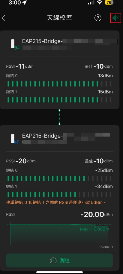 步驟 2. 在「校準」頁面中,可以查看主網橋/子網橋的 RSSI,要進行天線校準,請緩慢旋轉網橋並觀察即時的 RSSI數值,尋找兩個 RSSI 值都較高且差異最小的角度即為最佳角度。