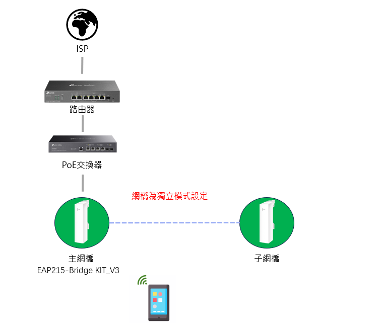 下列架構路由器的 WAN 連接至網際網路,並在 LAN 端擔任 DHCP 伺服器。出廠設定的網橋套組(包含主網橋與子網橋)上電後,主網橋透過乙太網路線連接至交換器,並獲取同網段內的 IP,網橋為獨立模式