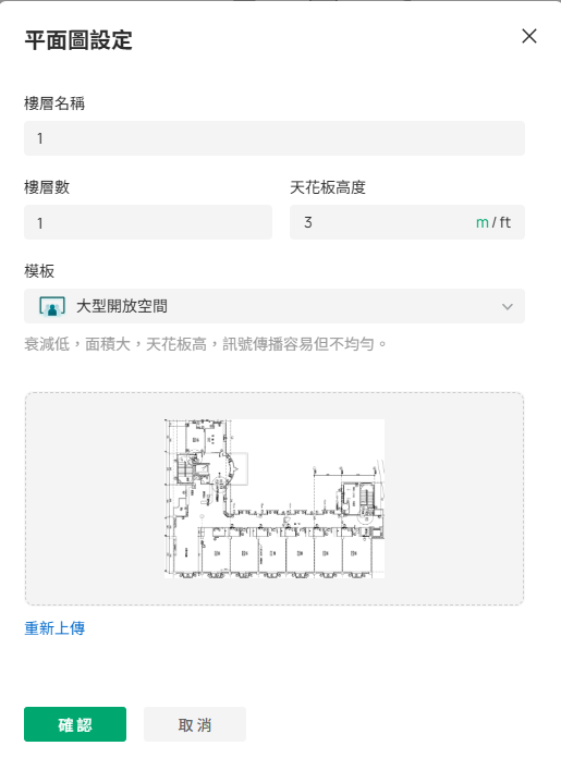 步驟 2:指定樓層名稱、樓層編號和天花板高度。選擇最符合您環境的佈局,以確保更準確的模擬。點擊 確認 以繼續。