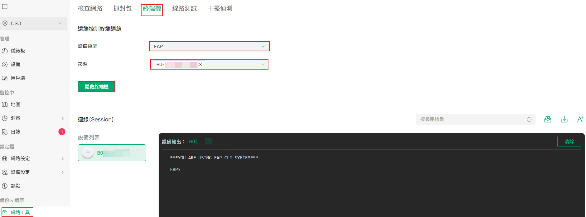 步驟 1、 前往 網路工具 -> 終端機,選擇 設備類型,來源請選要連接的設備,接著開啟終端機