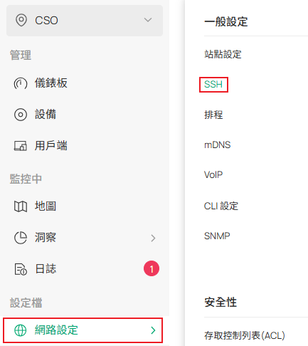 步驟2、 如需用其他終端軟體存取CLI,前往, 網路設定 -> SSH