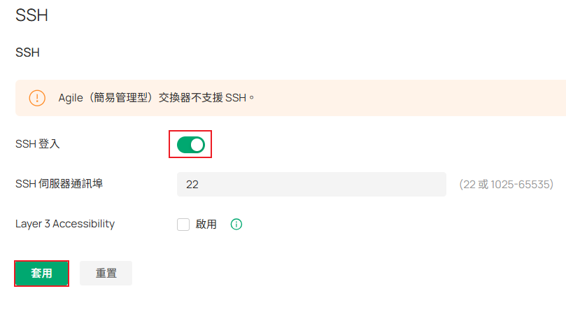 Server Port 表示用於SSH的通訊埠,如需透過不同網路連接,可勾選 Layer-3 Accessibility,系統僅接受來自相同網路的連接。