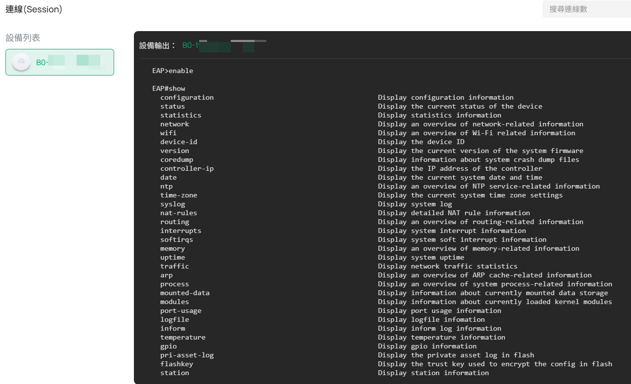 A: 目前 Omada AP 所支援的所有 CLI 指令僅供「查看」特定資訊;使用者無法透過 CLI 指令對 Omada AP 進行任何參數設定。