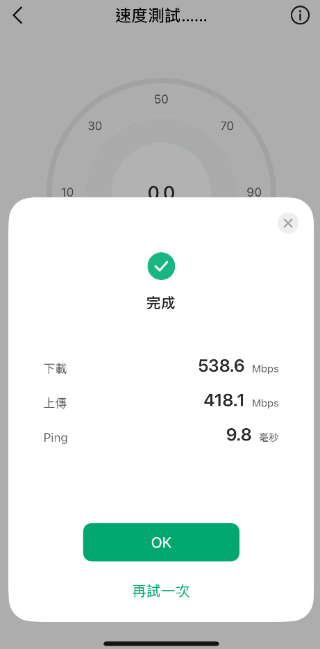 步驟 4. 在測速完成後,可查看測試結果,點選「OK」退出,或點選「再試一次」再次進行測試。