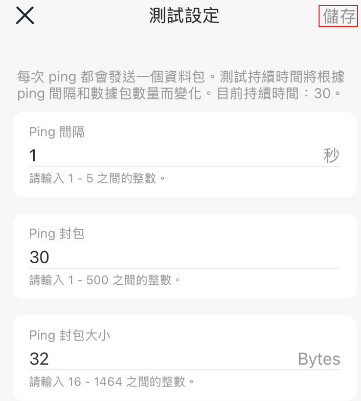 步驟 4. 設定「Ping 間隔」、「Ping 封包」及「Ping 封包大小」,後點選「儲存」。