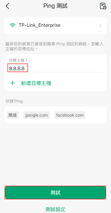 步驟 5. 輸入目標主機,然後點選「測試」以開始 Ping 測試。