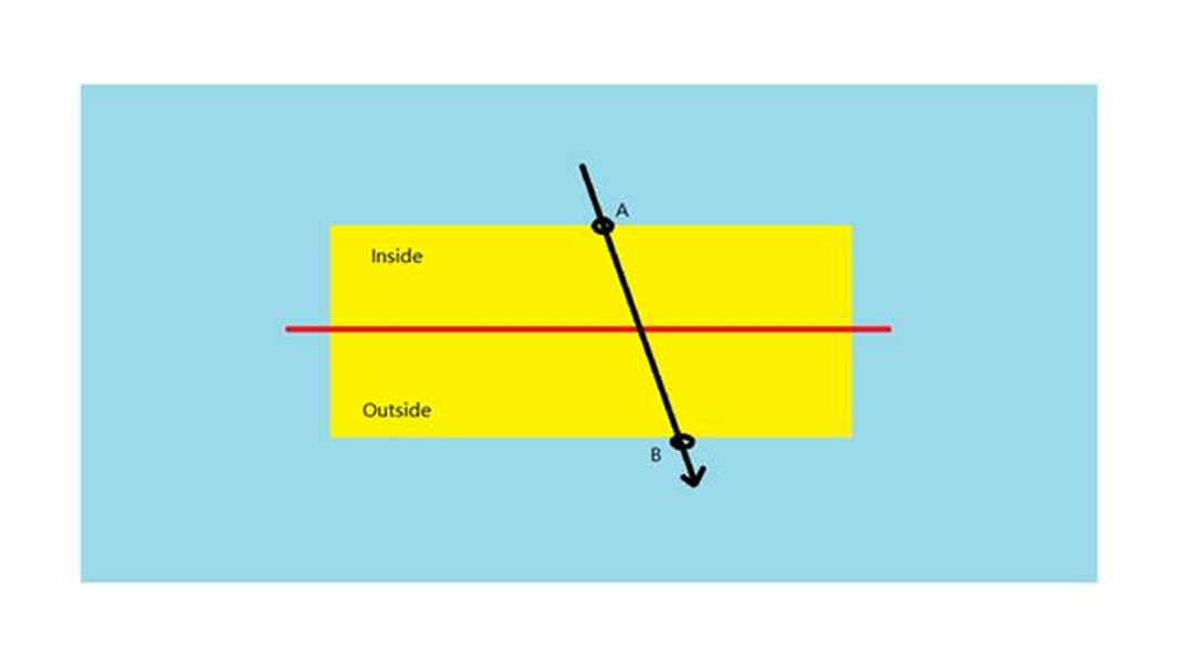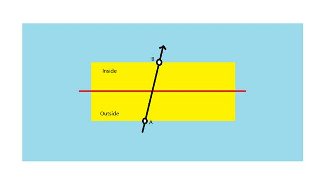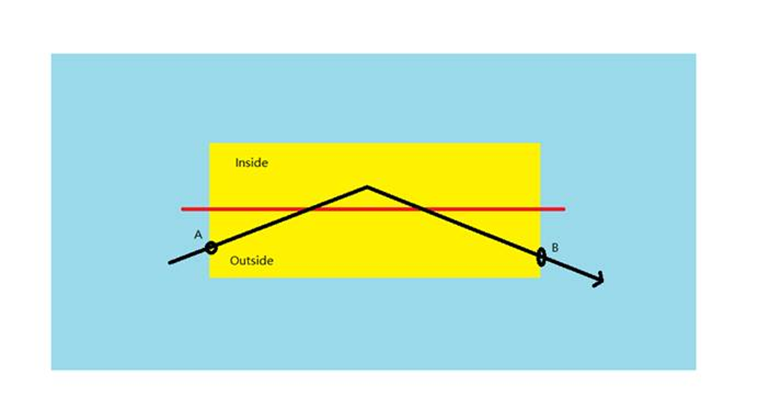 在下圖中,黑線代表人頭的軌跡,在黃色區域內從底部移動到頂部。人頭從藍色區域移動到黃色區域,然後回到藍色區域,產生兩個交點:A 和 B。