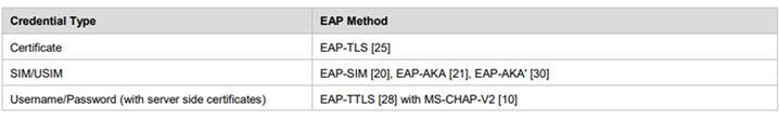 Giao thức Hotspot 2.0 quy định các phương thức xác thực được mạng hỗ trợ, như được trình bày trong bảng dưới đây.