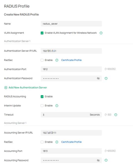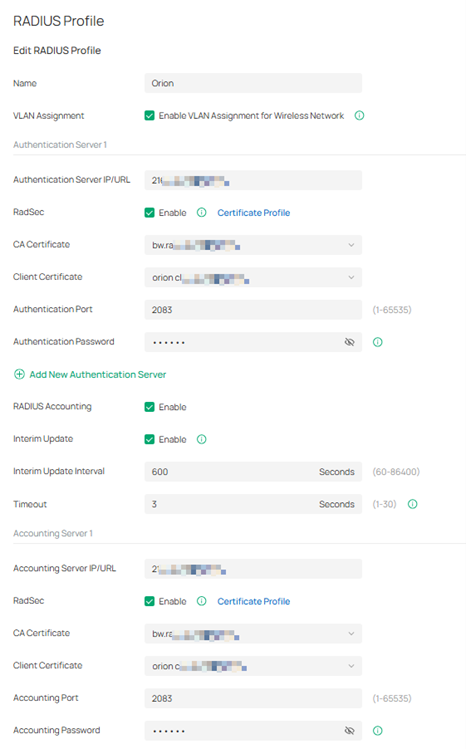 Dưới đây là cấu hình RADIUS Profile không yêu cầu tính năng RadSec.