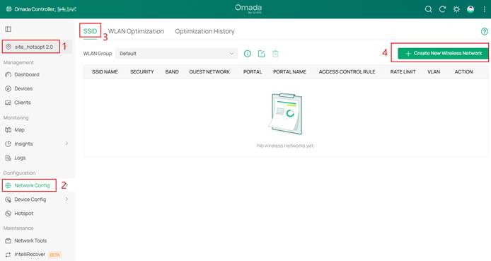 Bước 1: Truy cập Site View > Network Config > Network Settings > WLAN > SSID, sau đó nhấn Create New Wireless Network (Tạo mạng Wi-Fi mới).