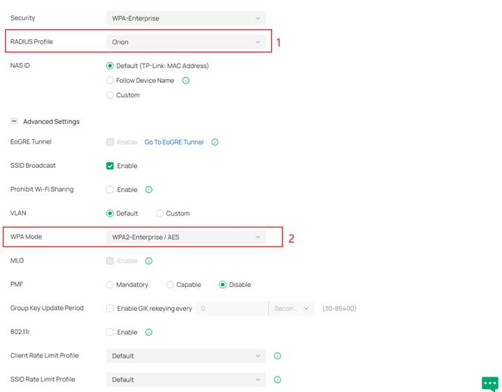 Sau đó vào Advanced Settings > WPA Mode, chọn WPA2-Enterprise/AES hoặc WPA3-Enterprise.