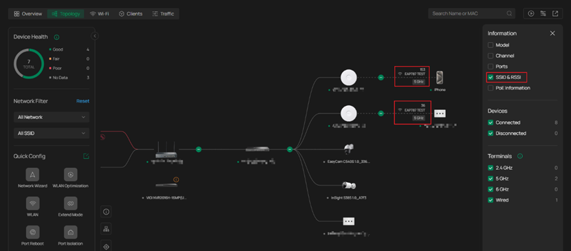 Bảng điều khiển mới ở bên trái (Quick Config panel) cung cấp cái nhìn tổng quan rõ ràng về toàn bộ topology mạng của bạn, giúp bạn nhanh chóng nắm bắt cách các thiết bị được kết nối. Panel này cũng cho phép bạn lọc thiết bị theo VLAN hoặc SSID, đồng thời làm nổi bật các thiết bị cụ thể trên sơ đồ để hỗ trợ phân tích và xử lý sự cố dễ dàng hơn.