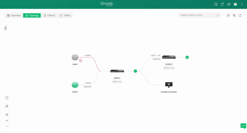 Lưu ý: Khi một thiết bị hoặc đường WAN bị ngắt kết nối khỏi controller, điều này sẽ được thể hiện trên sơ đồ Topology bằng đường kết nối màu đỏ và biểu tượng mắt xích bị đứt.