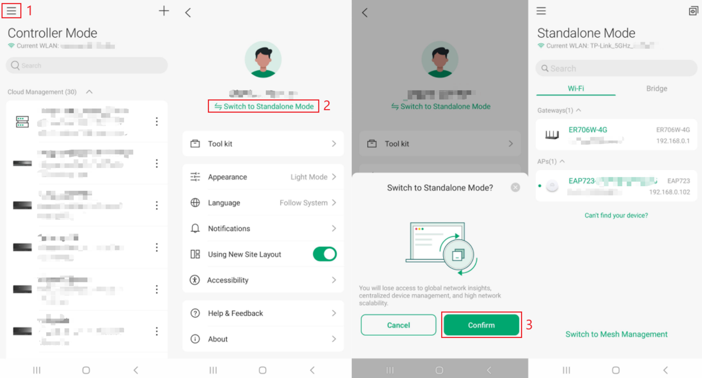 Để chuyển từ Controller Mode sang Standalone Mode, hãy chạm vào biểu tượng menu ba gạch, chọn Switch to Standalone Mode, sau đó chạm Confirm.