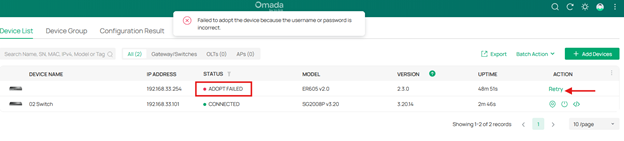 Theo mặc định, controller sẽ adopt các thiết bị Omada mới bằng thông tin đăng nhập mặc định (admin/admin). Nếu thiết bị đã được cấu hình với thông tin đăng nhập khác, controller sẽ không thể adopt thiết bị đó.