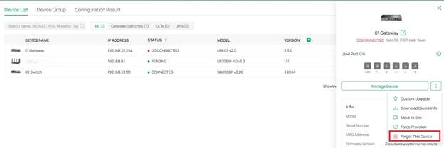 Bước 3: Thực hiện Forget Omada Gateway hiện tại trên controller. Nhấp vào gateway, bấm biểu tượng ba chấm bên cạnh Manage Device, sau đó chọn Forget this device.