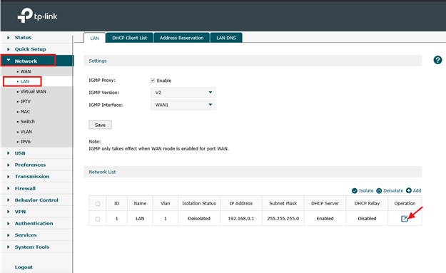 Sau khi đăng nhập, vào Network > LAN, chỉnh sửa VLAN mặc định và điều chỉnh thông tin địa chỉ IP (như IP gateway, IP bắt đầu và IP kết thúc) để phù hợp với subnet hiện tại của mạng.