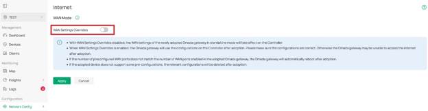 - Khi đang ở Site View Mode, truy cập Network Config > Network Settings > Internet. Bật WAN settings overrides và chọn model của Omada Gateway.