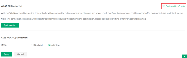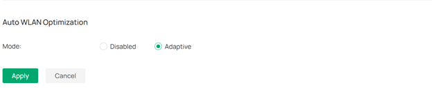 Sau khi hoàn tất cấu hình SSID, truy cập vào Controller > Network Config > Network Settings > WLAN > WLAN Optimization > Auto WLAN Optimization, chọn chế độ Adaptive, sau đó nhấn Apply để áp dụng cấu hình.