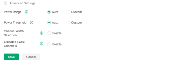 Chuyển Mode sang Custom, sau đó trong mục Advanced Settings, bạn có thể tùy chỉnh dải công suất phát và ngưỡng (threshold), chọn độ rộng kênh (channel width) và loại trừ các kênh 5 GHz.