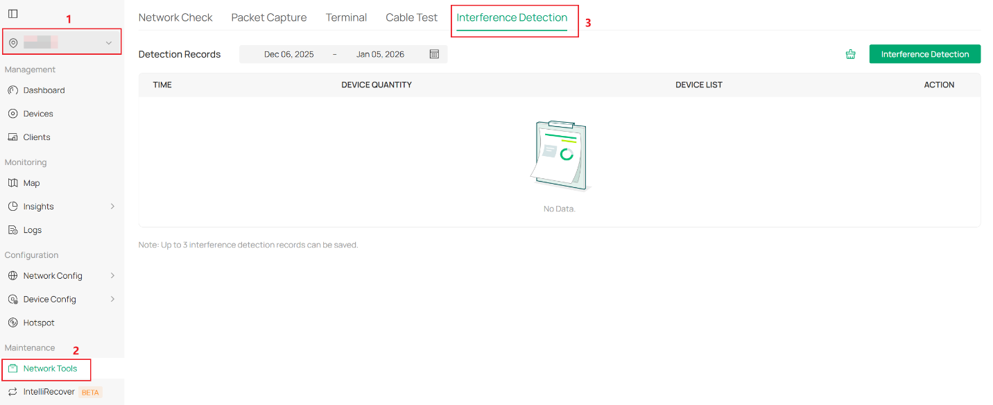 Bước 1. Truy cập trang Network Check tại Site > Network Tools > Interference Detection.